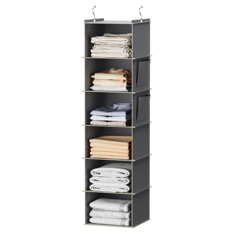 Compact at 12 inches deep by 12 inches wide, this hanging organizer takes advantage of unused vertical space in the closet. The 48-inch-long closet organizer consists of six shelves with endless potential for clothing and linen storage. For busy professionals or students, you could even use these shelves to organize your outfits for the work or school week ahead of time, saving time and stress each morning.