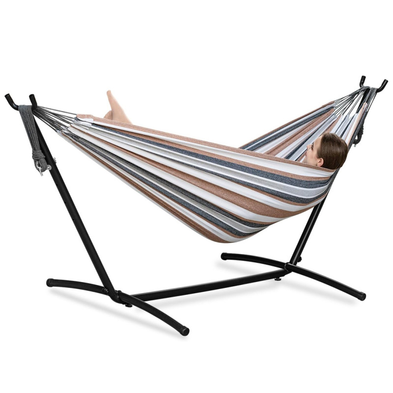 The polyester and cotton blend securely attaches to a steel frame with a black finish that provides stability, with no wobbling or creaking. The metal frame is made of welded steel, stands about nine feet long and can be used  both indoors and outdoors. Additionally, in line with other standard hammock designs, this frame features angled supports, a base runner, and legs, with 360-degree joints to provide long-lasting use. The vertical bars have adjustable steel hooks that allow you to hang the hammock in a variety of positions according to your comforts.