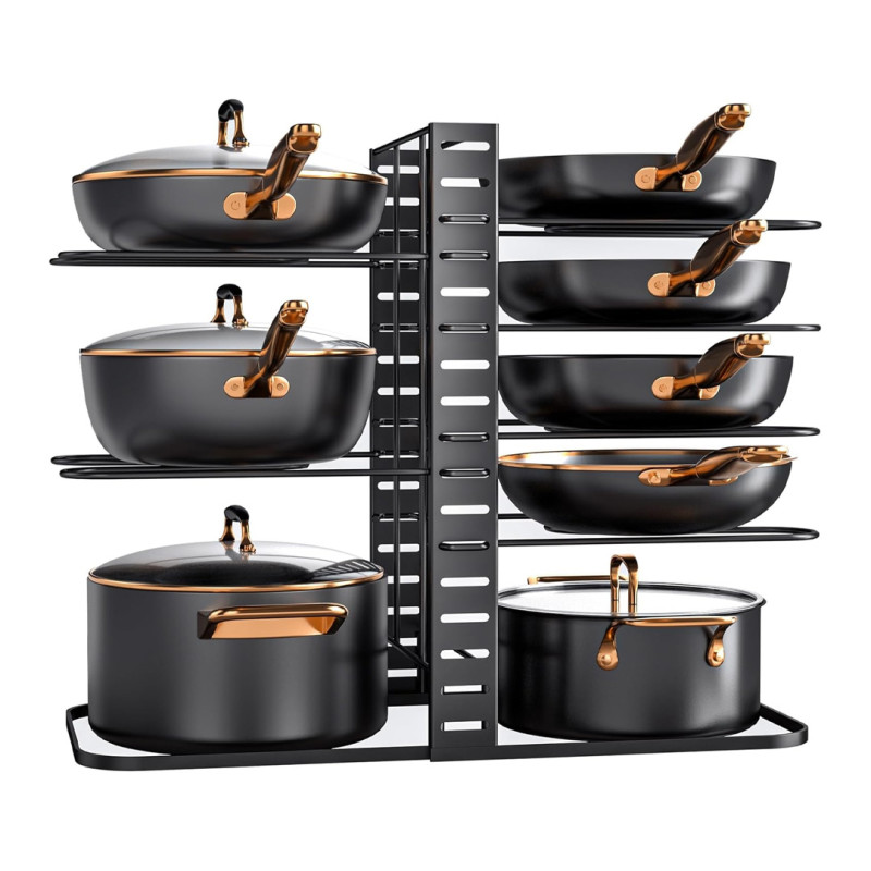 This iron cookware rack from Mudeela features eight adjustable tiers and is designed to hold smaller cookware up to 11 inches — frying pans, cutting boards, pots and lids, baking pans, and so on. In order to fit the organizer inside a cabinet, you’ll need at least 21.4 inches of width, 17.5 inches of height, and a depth of 20.8 inches. Mudeela’s flat-heel base design helps keep the rack stable and steady, so you shouldn’t have to worry about it wobbling or tipping as you add some real weight to it.