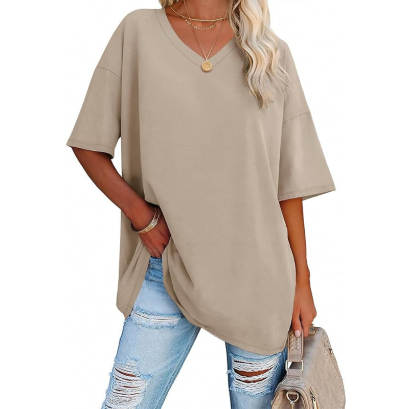 One of the best things about this t-shirt is its versatility. Constructed with a V-neck design, roomy short sleeves, and a long hem that hits around the upper thigh, this tee is perfect for casual and dressy looks alike. It can be worn over leggings for workouts or lounging, it can work as a base layer on colder days by pairing it with a cardigan or shacket, or style it with jeans and elevate the look with some jewelry.