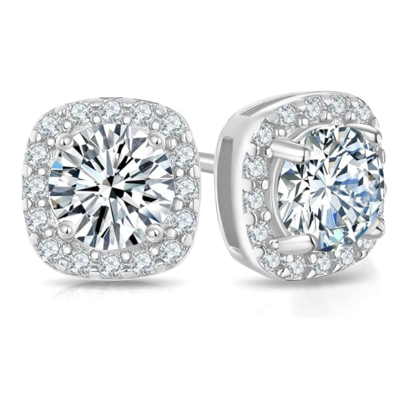 You can get the earrings in gold or white colors and several different styles. While we love the square look, you can also get round and square earrings with and without the halo design.