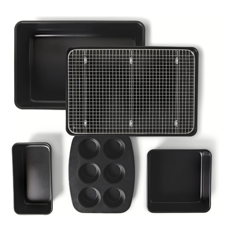- What’s included: This six-piece set includes a cookie sheet, a muffin pan, a square baking pan, a loaf pan, a roaster pan, and a cooling rack.