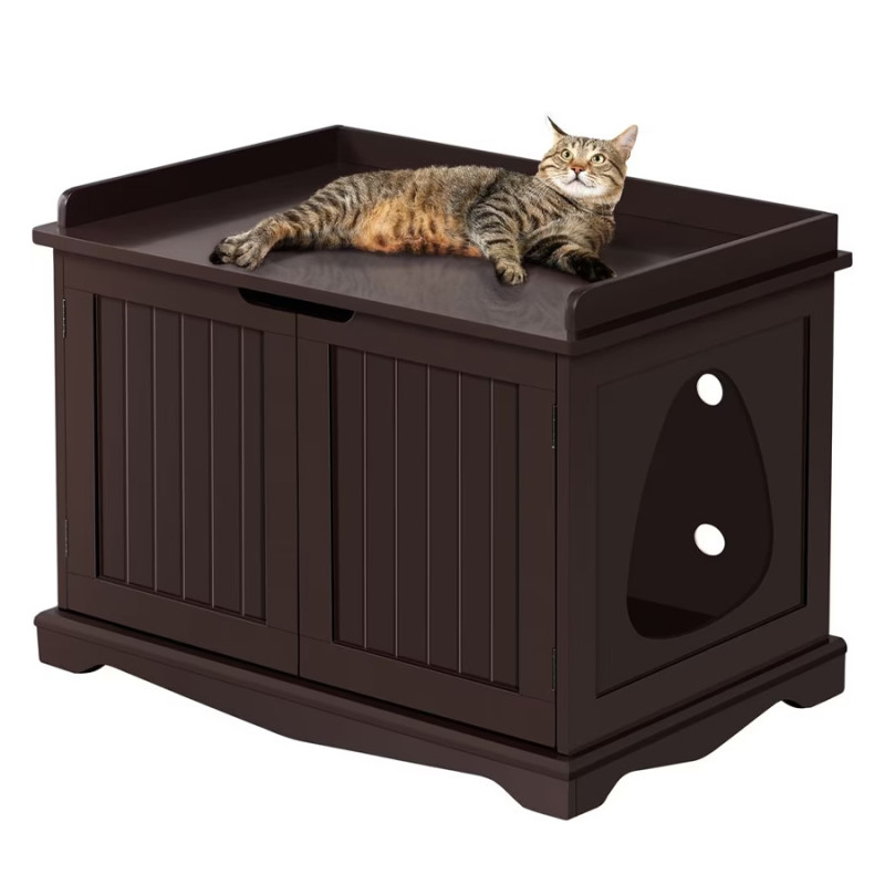 It comes with a divider that you can install inside if you’d like the litter box to have its own space, but you can leave this out and opt to put two litter boxes inside if you wish. The front has cabinet doors, and there’s an opening on the side for cats to come and go, which measures 10.2 inches long and 8.9 inches wide. You can also use the top for decoration or simply add a lounge mat so the cats can laze atop their skillfully hidden toilet.