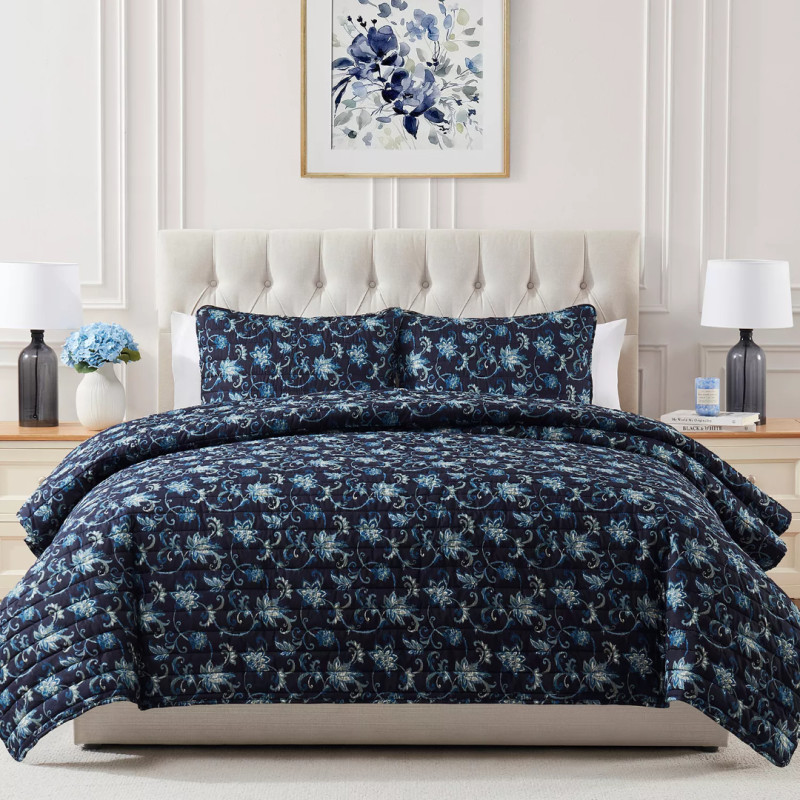 With a floral design that shoppers say is “so beautiful,” this $13 quilt set — which includes a quilt and two matching pillow shams — is hard to ignore. It features a deep navy blue background with lighter blue flower accents that can give your bedroom an elegant spring refresh. Thanks to its reversible feature, you can flip it over to reveal a solid navy color. Both sides have channel-stitched stripes for added texture and a classic quilt feel.