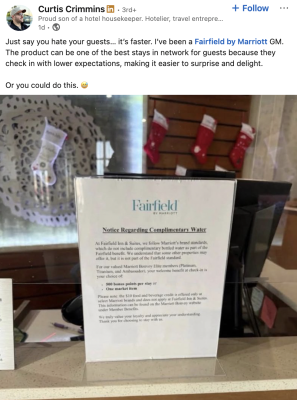 This drew immediate mockery from hotel industry insiders on LinkedIn (poster Curtis Crimmins identifies himself as a former Fairfield GM), for what they see as penny-pinching that makes a bad impression on guests.