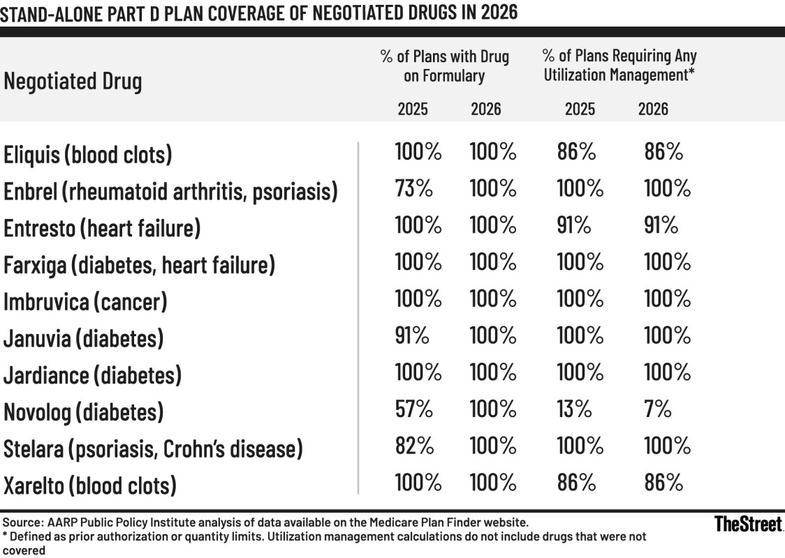 An AARP analysis found that access to the negotiated drugs improved alongside lower prices. While four of the drugs were not covered by every stand-alone Part D plan in 2025, all of the plans studied will cover all 10 drugs in 2026. Utilization management requirements such as prior authorization and quantity limits were largely unchanged.