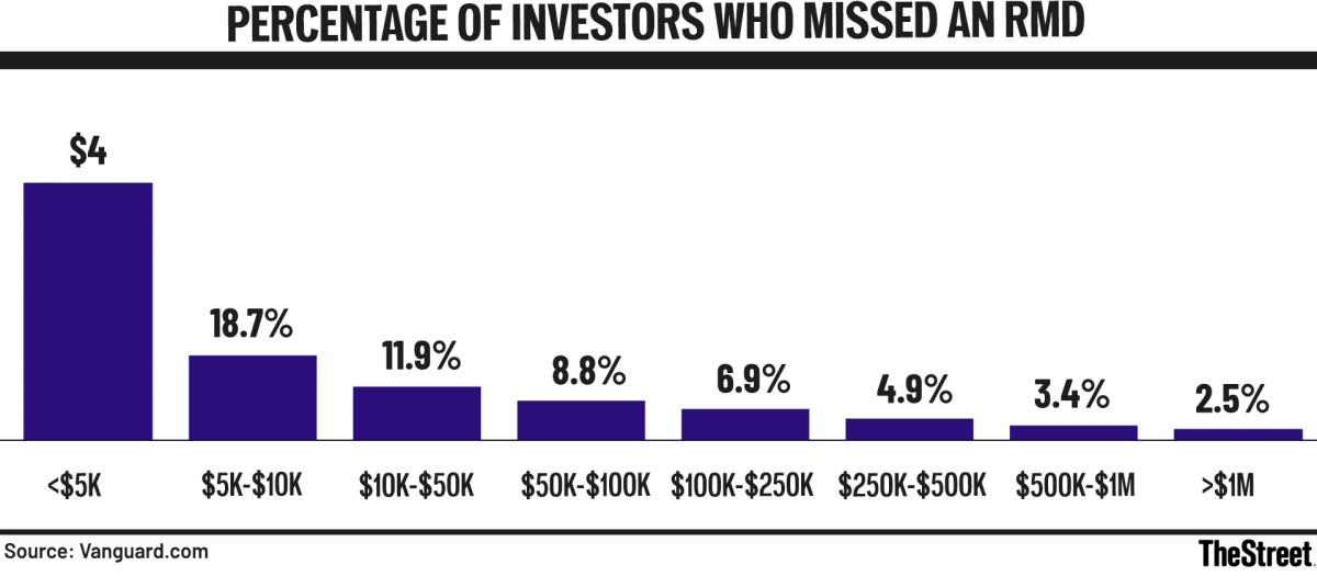According to Vanguard, missed RMDs are most common among self-directed investors with lower balances. The majority of investors (56.8%) with balances under $5,000 missed their RMD in 2024, while only 2.5% of investors with balances over $1 million did.