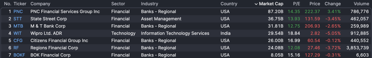 Many of the large bank reports have ceded room for smaller regional banks to report. Rounding out the first week of earnings season is PNC Financial, State Street, and M&T Bank Corp, among others. Notably, all of these firms but PNC are down after their report, while the broader regional bank ETF is off about 37 bips as of 10 a.m. ET.