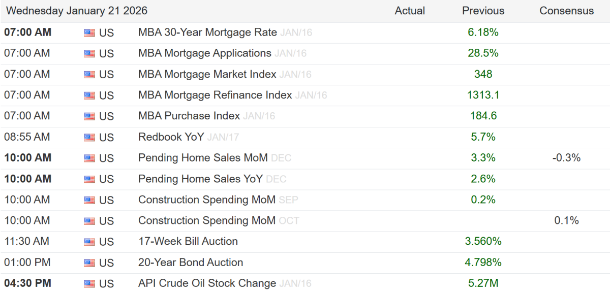 Economic Data + Events: Davos, Home Sales, Greenland Developments