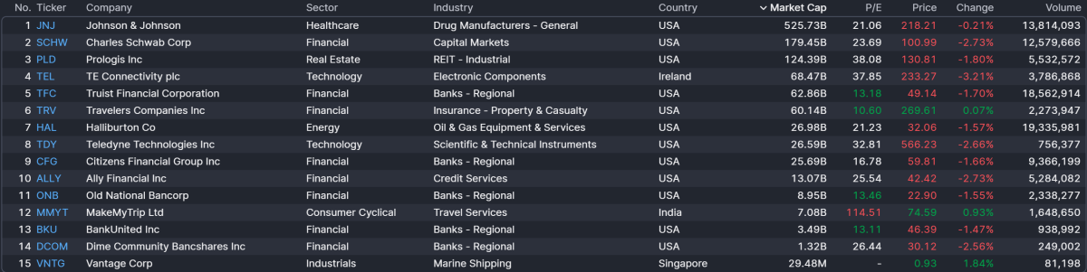 Today will see a wide variety of regional banks reporting, both in the premarket and aftermarket session. However, this morning’s biggest reports will come from health care giant Johnson & Johnson, brokerage Charles Schwab, and REIT Prologis, among others: