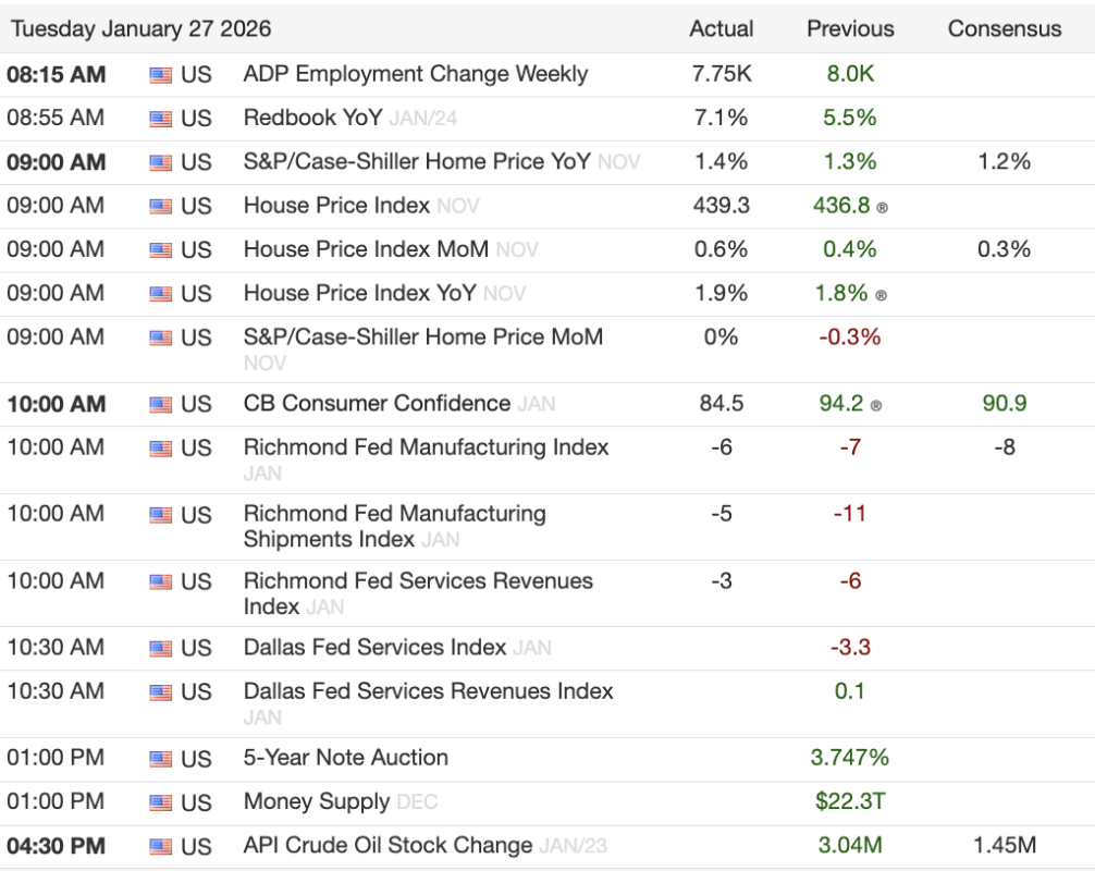 However, there are other economic reports to dig into, including the CB Consumer Confidence for January — which fell off a cliff month-over-month, down from 94.2 to 84.5. The decline was led by a 9.9 point drop in the “Present Situation Index” and a 9.5 drop in “The Expectations Index”, which came in at 65.1, a sign that the American public polled largely expects a recession ahead.