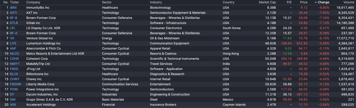AXT Inc (-7.95%) is next up, declining from recent spikes brought on by strong momentum and earnings. It has still more than doubled on the month, making it one of the more impressive runners in the market since the start of 2026.
