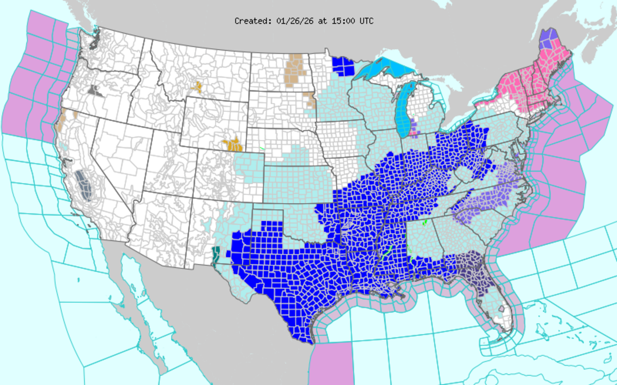 That storm has since moved northeast, leaving remaining pockets of the original warning in the northeast (in pink). In its stead, an Extreme Cold Warning (in dark blue) has been issued for large swaths of the U.S. population, which are contributing to higher natural gas prices.