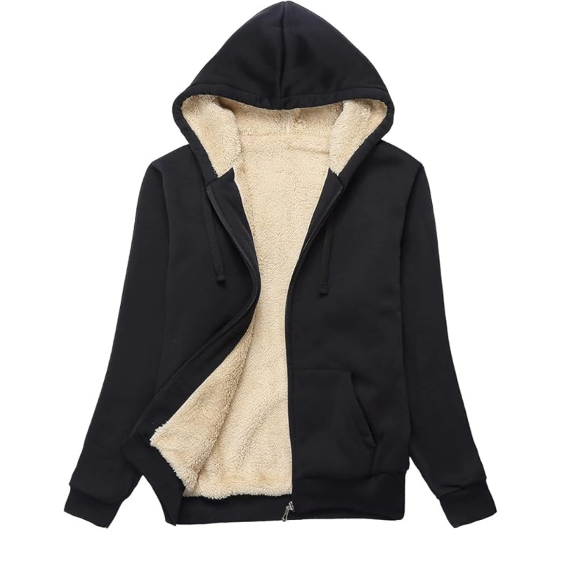This stylish, flattering hoodie is made of 55% cotton and 45% polyester and comes equipped with a full-length zipper closure for maximum warmth. It also features two pockets at the sides, a warm inner sherpa lining, ribbed cuffs, a ribbed hem, and a hood with a drawstring, so you can make on-the-fly adjustments to shelter your face and hands from the wind when the cold begins to bite.
