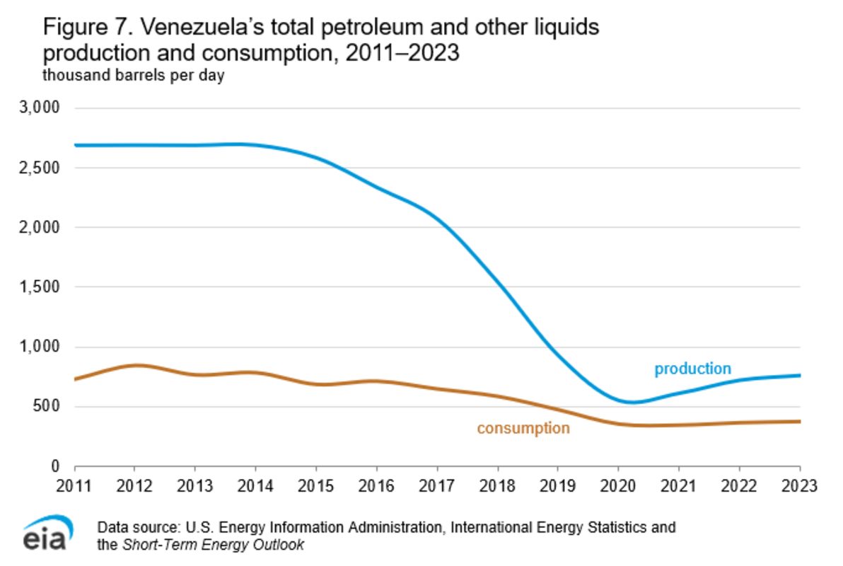 The industry was producing three million barrels of oil a day when the 21st century dawned, much of it shipped to refineries on the U.S. Gulf Coast. But the resource has been mismanaged, money siphoned off to do this and that and ultimately squandered, production facilities allowed to become obsolete and derelict. The daily production now is down around 1 million barrels a day, according to the EIA.