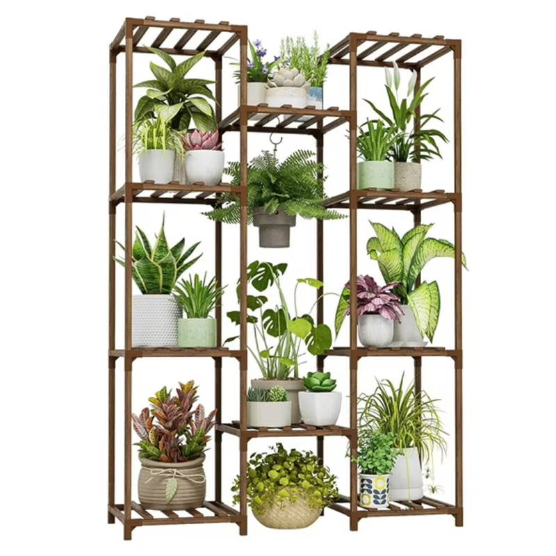 This plant stand is made from carbonized eucalyptus wood, which enhances its waterproof feature and extends the shelf’s overall life. The shelf is easy to set up with the included instructions, allowing you to spend less time fussing and more time decorating. No screws are needed; just attach the connection pieces to the wood frame, and you’re good to go. This stand features 10 shelves, with the middle shelves also acting as a plant hanger. The slotted shelving style allows more air flow for plants, water to dry up quickly, and for the sun to reach the plants more easily. It also offers more options to hang smaller items, like air plants, wind chimes, or other accessories.