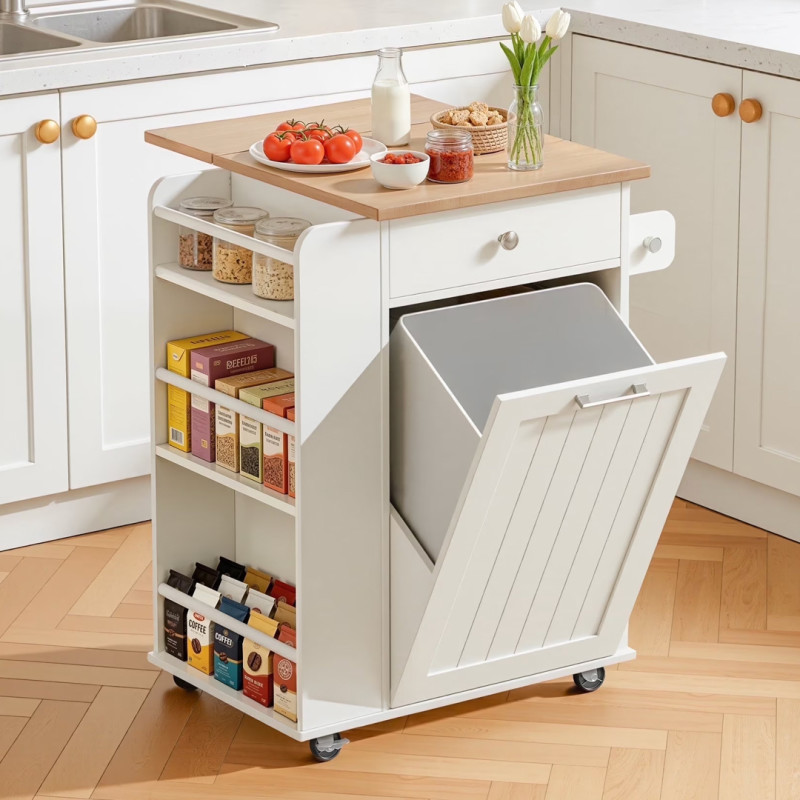 • Features: Built-in trash compartment, drop-leaf tabletop, detachable hanging storage handle, and rolling casters.