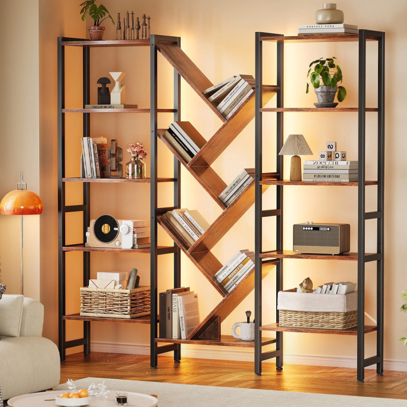 This bookshelf offers ten large, open storage shelves for a modern vibe, allowing you to show off collectables, plants, a record player, or handmade items, or use baskets or cubes to add a homey touch while also offering hidden storage and an easier way to store smaller items. It also features a middle book tree with seven more shelves, making it a great place to hold your vinyl records, books, magazines, comic books, DVDs, and more. It’s also an ideal option for family room blankets and TV accessories, allowing easy access to all your everyday items, or for use in the kitchen for appliances and bulk food items.