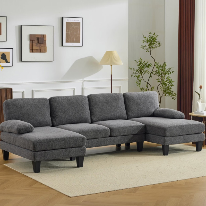Measuring 111.4 inches long, 48.4 inches wide, and 33.1 inches high, this sectional has a U-shape with longer, chaise fixtures at each end that are perfect for reclining or lounging fully extended, whereas the middle portion has a traditional sitting area. Those shorter sitting areas measure 20.9 inches long and 16.5 inches long, together creating more than enough room to comfortably seat four people at once.