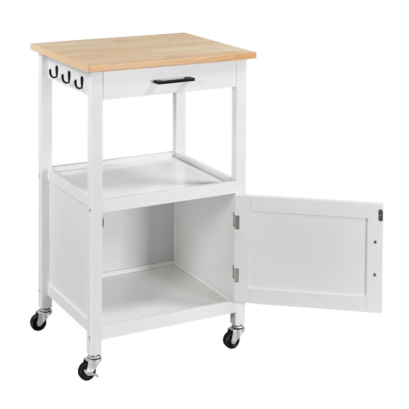 The simple design is easy to use and can fit into a variety of kitchen styles, and shoppers can choose from Black or White to best match their vibe. The storage features a slide-out drawer, measuring 11 inches by 16 inches, that can fit utensils, mail, or other smaller items, a middle open shelf, measuring 14 inches by 20 inches, that’s great for large appliances or baskets of fruit, and a large cabinet on the bottom of the cart that can hold coffee or tea accessories, appliances, pots and pans, dry goods, or other items. It also features side hooks to hang towels, oven mitts, or utensils.