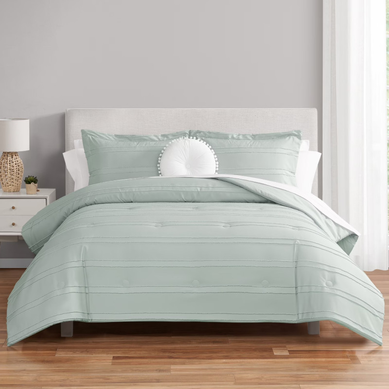 Made from polyester, each piece is soft and comfortable. The comforter and shams feature a pastel mint colorway with textured stripes, and the sheet set is crisp and white, making it versatile enough to pair with other comforters when you want to change up your style.